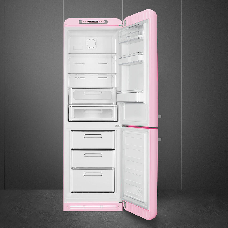 Холодильник SMEG FAB32RPK5 предназначен для кратковременного хранения различных готовых блюд, охлаждённых продуктов и напитков, а также для заморозки и длительного хранения замороженных продуктов и полуфабрикатов. Полки изготовлены из закалённого стекла, благодаря чему выдерживают большую нагрузку. Данная модель идеально подойдёт для авторских интерьеров в уникальном стиле или для кухонь в классическом исполнении.