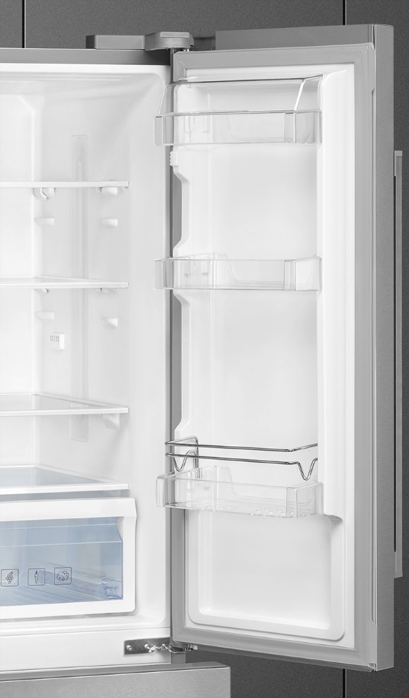 • На дверце расположены лоток для яиц и 8 полок: 2 с крышкой, 2 для бутылок, 4 обычных