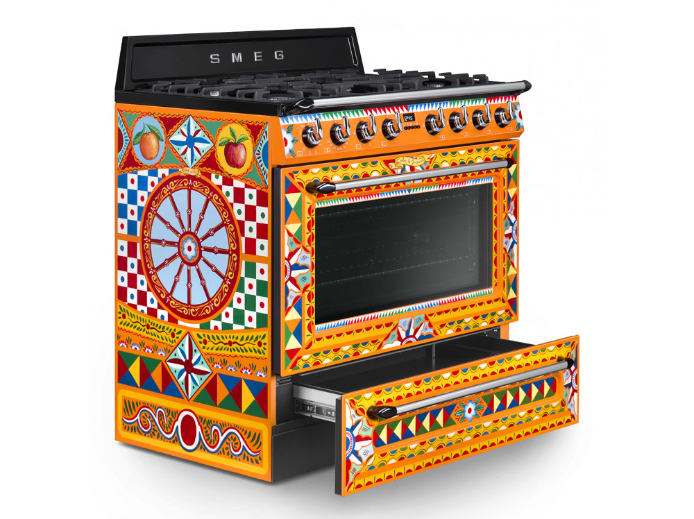 Взрыв ярких красок, полный повествовательного акцента: украшение этого кухонного прибора черпает вдохновение из мотивов традиционной сицилийской тележки, используемой странствующими торговцами цитрусовыми фруктами и десертами изо льда, которую можно найти в самых живописных уголках Сицилии. Формы и цвета воспевают поэтику этого образа, одного из самых узнаваемых фольклорных символов острова. Фронтальная часть варочного центра украшена геометрическими, полихромными и ромбовидными мотивами, используемыми и в напольной плитке и стилизованными звездочками и цветами, которые отсылают к нежной весенней атмосфере.