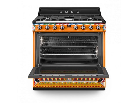 Smeg — отдельностоящий варочный центр в элегантном исполнении. Модель оборудована многофункциональной духовкой с пятью уровнями размещения противней и подсветкой, а также газовой панелью с автоматическим поджигом конфорок. Дверца устройства имеет трехслойное остекление и снабжена практичным доводчиком SoftClose.