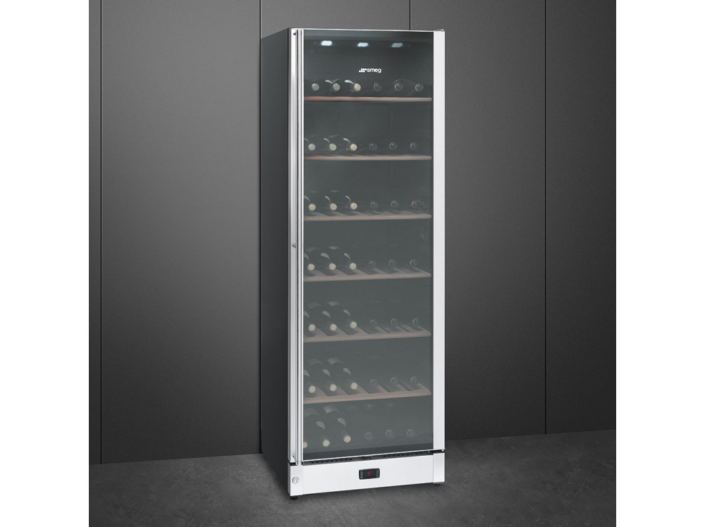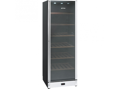 Винный шкаф SMEG благодаря современным технологиям обеспечивает правильные условия для хранения винных напитков. Цифровой термометр позволяет контролировать климат внутри камеры. LED-лампы ярко освещают отделение, не влияя на изменение температуры. Электронное управление отличается точной и быстрой установкой параметров. Замок двери гарантирует безопасное использование.