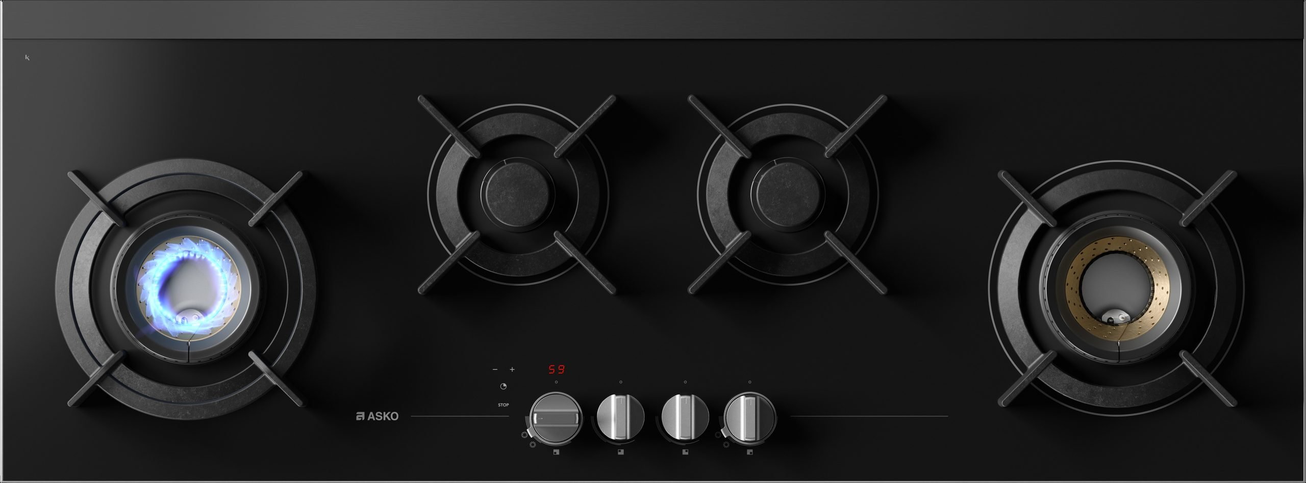 Варочная панель Asko HG8144BGB1 — удобная и современная, очень широкая, 111 сантиметров, с комфортным расположением четырех конфорок. Благодаря оригинальному размещению рабочих зон на варочной поверхности можно использовать крупногабаритные кастрюли и сковороды. Две горелки компактные, а две — большие, повышенной мощности, WOK Fusion Volcano. Это инновационная конфорка для вок-готовки. В отличие от обычных горелок, эта модель оснащена тремя рядами пламени, расположенными один под другим. Такая конструкция позволяет сосредоточить нагрев в центре, что не только увеличивает скорость приготовления, но и делает возможным использование традиционной вок-сковороды. Для удобства рекомендуется применять специальный держатель-насадку.